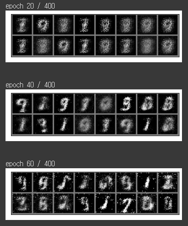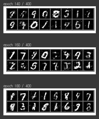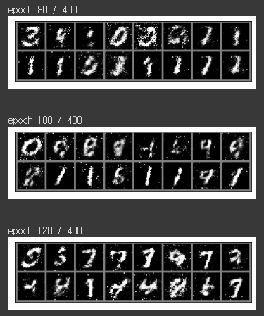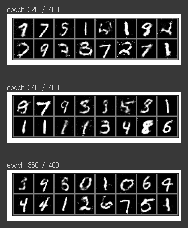 400 에폭을 학습해감에 따라서, 만들어내는 숫자들이 깔끔해지는 것을 보실 수 있습니다.