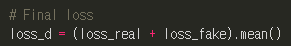 마지막으로, loss_real과 loss_fake를 합해주고, 이를 평균 내는 것이 논문의 내용이였으므로 .mean()을 해줍니다.