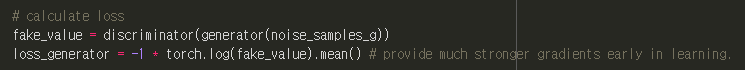 loss_generator = -1 * torch.log(fake_value).mean() # provide much stronger gradients early in learning.