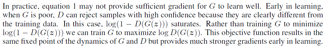 즉 $log(1-D(G(z^{(i)})))$를 최소화하는 것이 아니라, $logD(G(z))$를 최대화하는 쪽으로 학습하라는 것입니다.