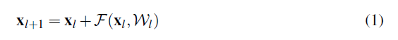 $x_l$과 $x_{l+1}$은 network에서 $l$번째 unit의 input과 output을 의미하며, $\mathcal{F}$은 residual function이고 $\mathcal{W}_l$은 block의 parameter를 나타냅니다.