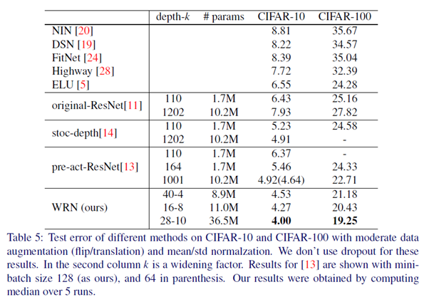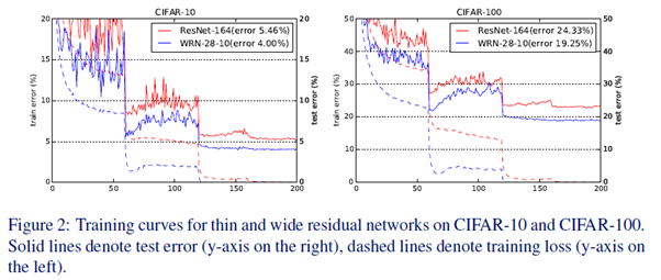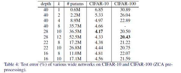 또한, wide WRN-28-10은 thin ResNet-1001보다 36배 더 적은 layer를 가지고 CIFAR-10에서 0.92%, CIFAR-100에서 3.46% 더 좋은 성능을 냈습니다.