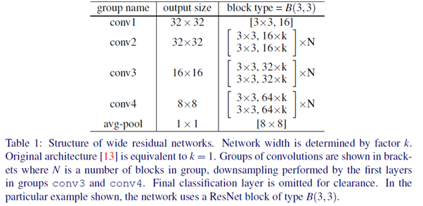 conv1의 사이즈는 모든 실험에서 고정이며, 반면에 새롭게 도입된 widening factor $k$는 3개의 그룹 conv2-conv4에서의 residual block의 width를 변경합니다.