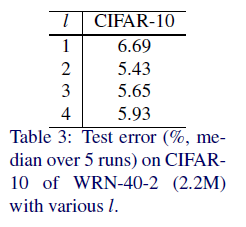 Table 3에서 결과를 제시하고 있으며, WRN-40-2 with 3x3 convolution을 사용하여 실험을 진행하였다.