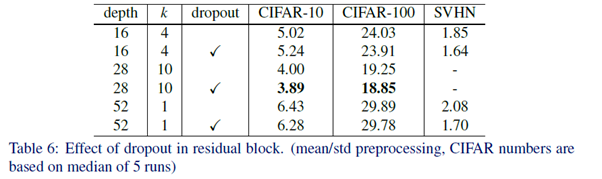 Dropout은 WRN-28-10을 가지고 CIFAR-10과 CIFAR-100에 대해서 test error를 감소시켰으며, 다른 ResNet에서도 동일한 성능 향상을 가져왔다.