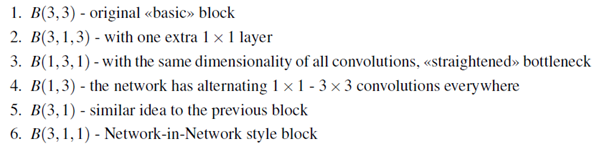또한 파라미터의 수를 유지하기 위해서, $B(3, 3), B(3, 1, 3)$의 경우는 더 적은 수의 layer를 가지는 네트워크를 사용하였습니다.